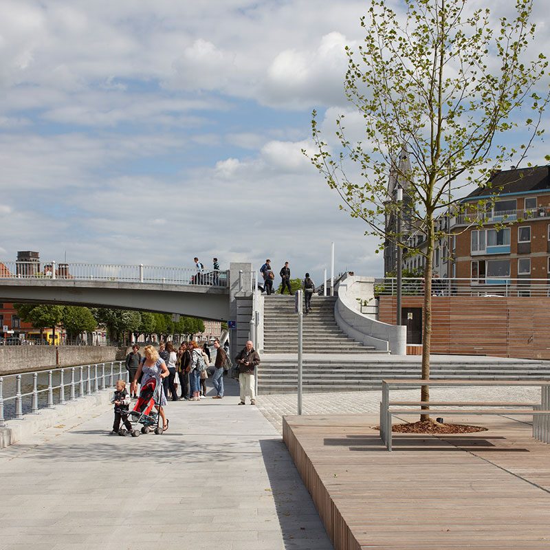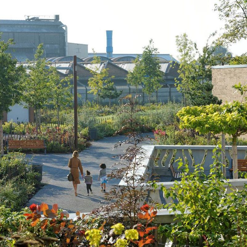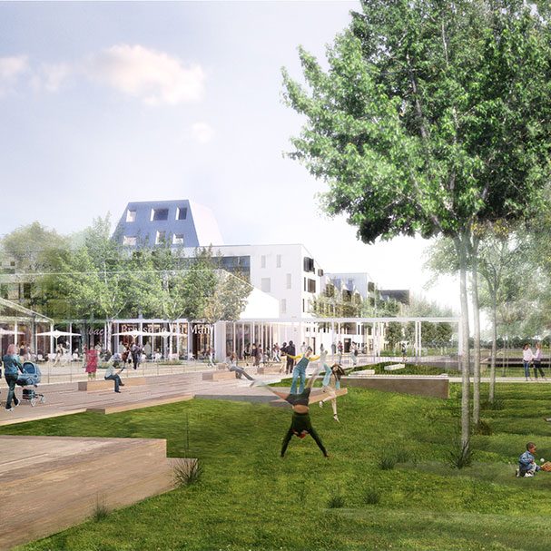 Une frange boisée est implantée un nord du site et semble s’élever vers le ciel en suivant les différents niveaux des constructions. Celle-ci ondule d’est en ouest et coule pour descendre dans les cours d’école enclavées. Cela participe également au confort thermique des classes et protège les cours d’école des vents dominants.